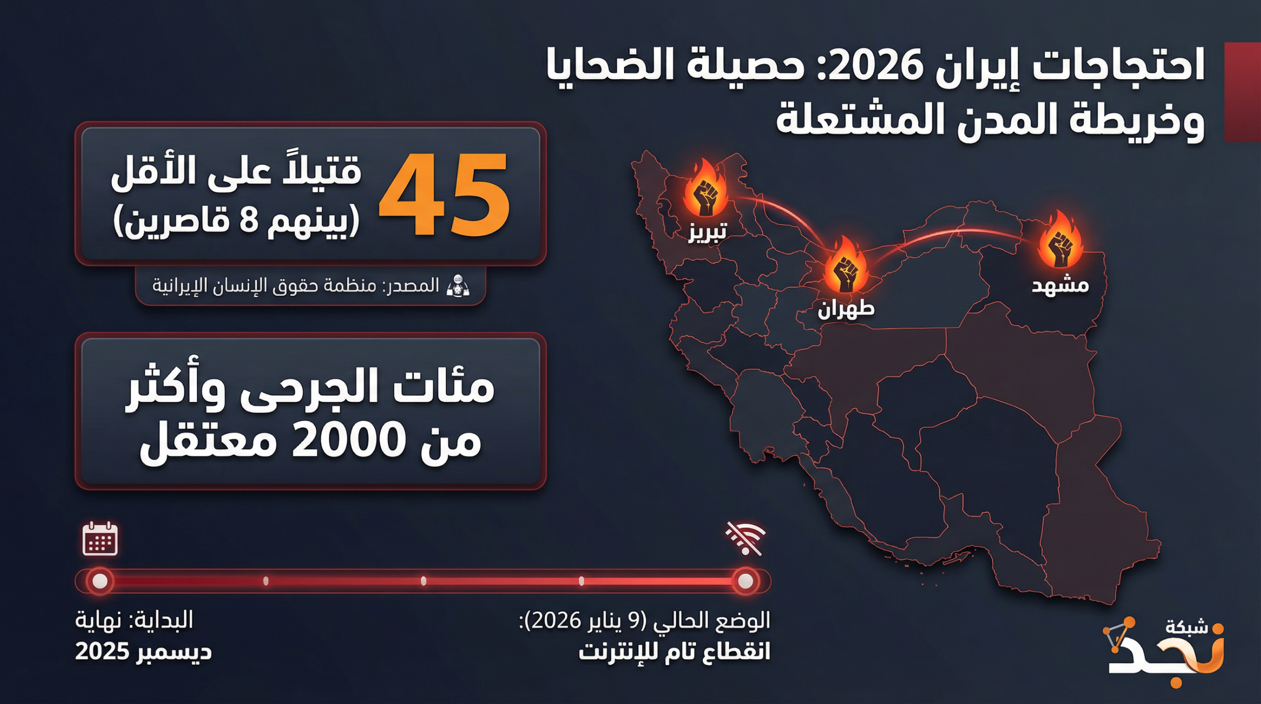الحصيلة البشرية: أعلنت منظمة “إيران هيومن رايتس” عن مقتل 45 متظاهراً على الأقل، بينهم 8 قاصرين، منذ انطلاق الاحتجاجات في ديسمبر الماضي.